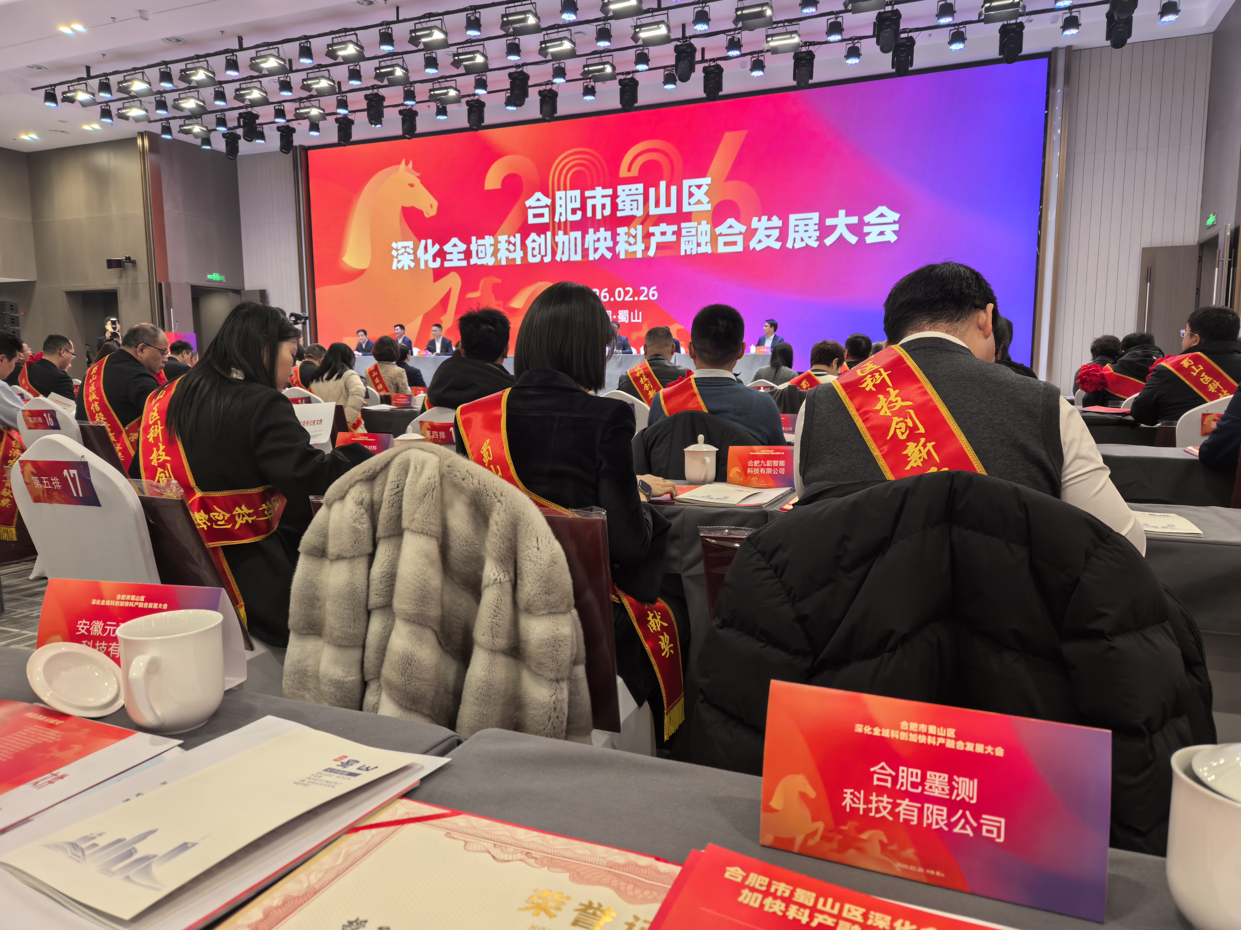 2026年2 月 26 日,蜀山区深化全域科创加快科产融合发展大会隆重召开。合肥墨测科技有限公司凭借在科研仪器领域的卓越创新贡献,成功斩获科技创新贡献奖!